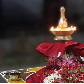 Bhagawati Seva with Padmam is conducted at Bhagawati/Devi Temple (or at Shiva-Parvathy Temple where there will be separate idol and pooja performed for Devi/Bhagawati). The ritual involves a priest drawing a sacred Padmam (lotus) diagram on the floor using colored powders, placing a lamp in the center, and invoking the Goddess to reside within it while chanting powerful mantras.